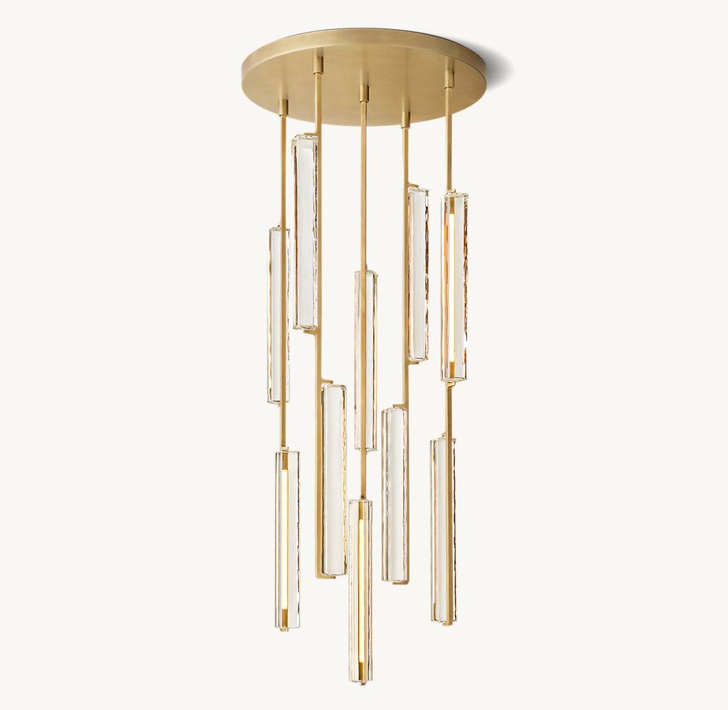 Capturing the spirit of 1960s Italian minimalism, Audubon appears to cascade from above with ten prisms of hand-polished K9 crystal on vertical brass drops. At once striking and restrained, the collection by Daisy evokes the warmth of candlelight with elongated LEDs that shed beautiful light through the undulating texture of the glass.